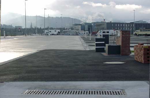Die Parkflächen bestehen aus Ökopflaster und die Straßen sind asphaltiert.